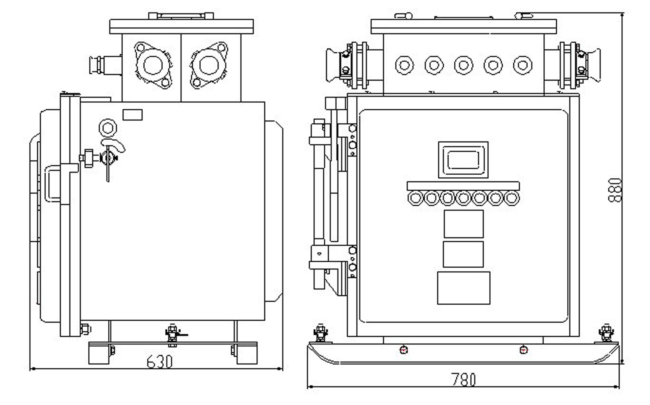 綜合裝置由隔爆外殼、主變壓器和控制部分等組成。隔爆外殼為方形,殼蓋與殼身采用滑動止口結構,開啟方便。外殼上部的接線箱作為引進和引出電纜用,外殼右側裝有操作組合開關的手柄,并有可靠的機械聯(lián)鎖裝置,門蓋上裝有控制按鈕和試驗按鈕,門蓋上有一觀察窗,可以從外面觀察到裝置里面液晶漢顯顯示屏的指示狀態(tài)。殼體內的控制部分由控制器件板和真空交流接觸器板組成。在控制器件板上裝有微電腦控制器、液晶顯示屏、電流取樣板、電流傳感器、濾波器、電源控制變壓器、試驗電阻、保險等器件。真空交流接觸器板上裝有真空交流接觸器、管式熔斷器,電流互感器,三相電抗器等器件?刂破骷迮c真空交流接觸器板通過一組航空插件及連線構成聯(lián)系。防爆外殼箱體內裝有主變壓器。